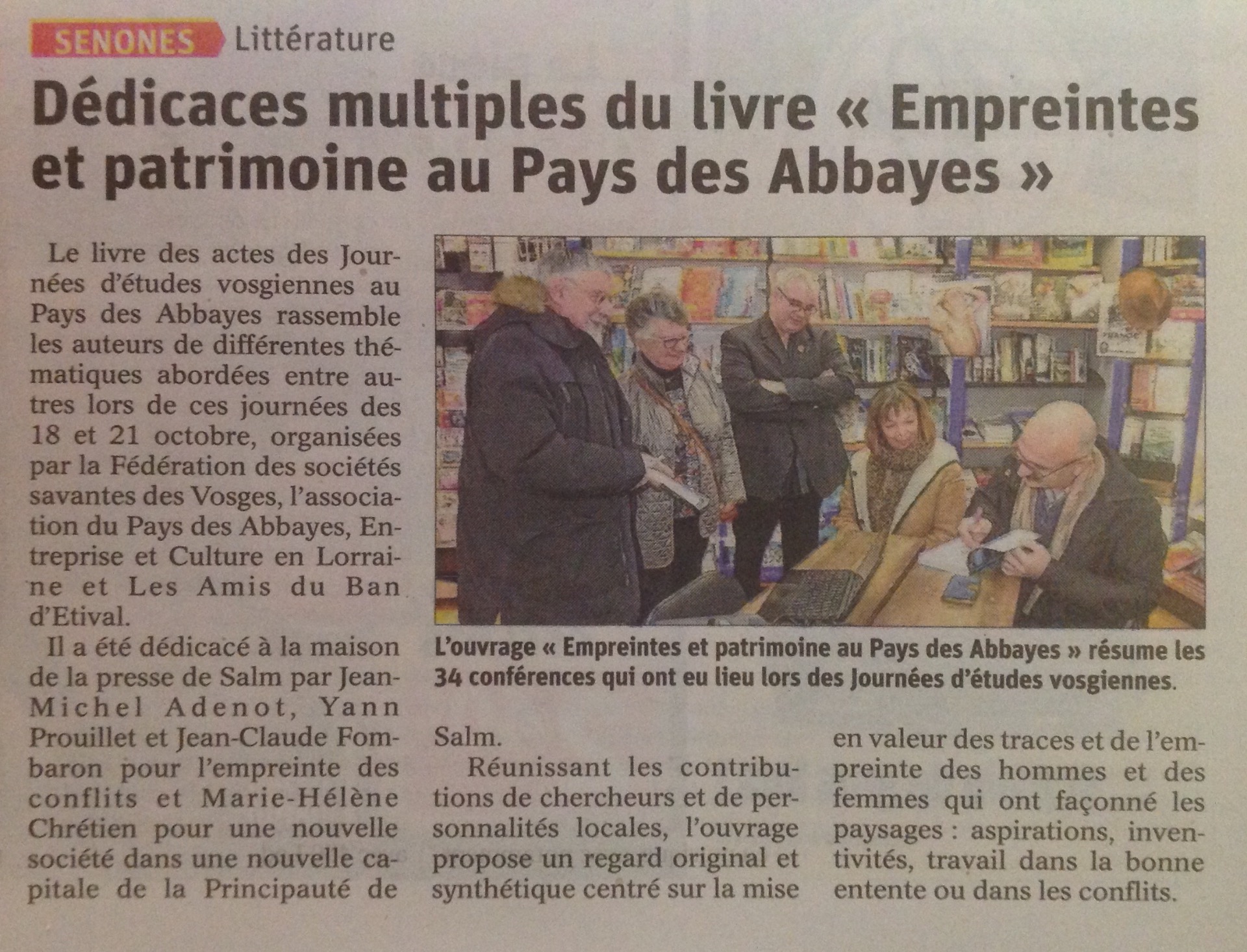 * samedi 30 novembre 2019 (9h-11h) : participation à la dédicace collective des actes du colloque JEV 2018 (maison de la presse ZERNOUH, Senones).